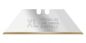XL Premium Gold 2 Notch Heavy Duty Trimming Utility Blades. Made From High Quality 1.25% Carbon Steel With a Polished Finish Featuring a TiN Coated Cutting Edge. The Titanium Nitride (TiN) Coating improves wear resistance and extends blade life. This is ideal for preventing breaking when cutting through those more abrasive materials.