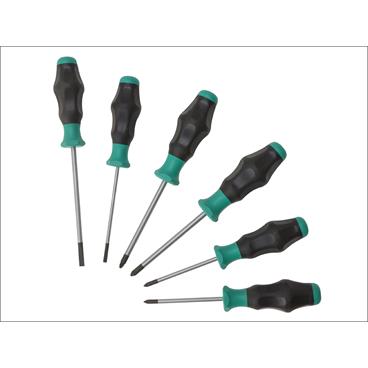 Wera Kraftform® Comfort 6 piece screwdriver set suitable for all general purpose screwdriving tasks with comfortable ergonomic handles which are moulded directly onto the blade for strength and with anti-slip etched screwdriver tips.