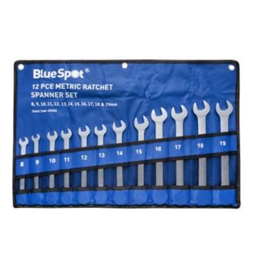 The Blue Spot Tools 12 PCE Ratchet Spanner Set is manufactured from chrome vanadium, heat-treated and chrome plated for increased durability. 5° ratcheting increments make the set ideal for use in tight spaces. Fully polished mirror finish.